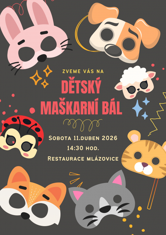 Pořadatelé zvou děti i jejich rodiče na dětský maškarní bál, který se uskuteční v sobotu 11. dubna 2026, od 14.30h na sále Radnice.